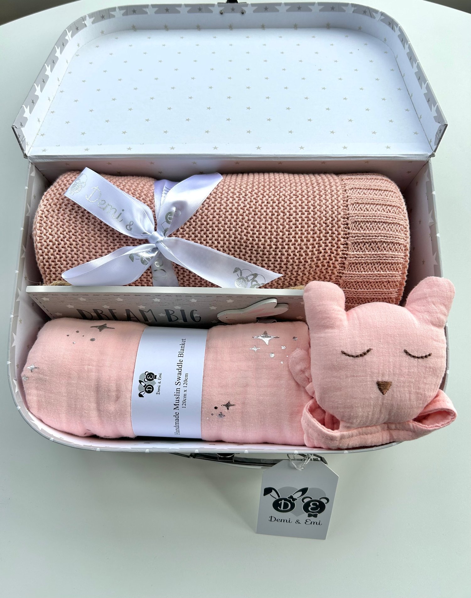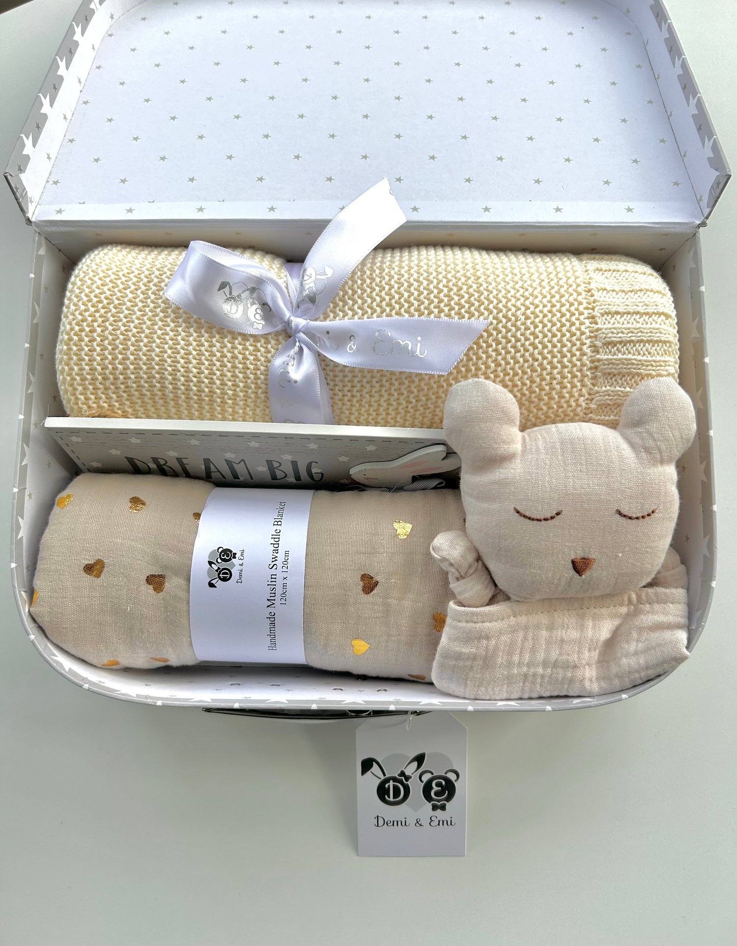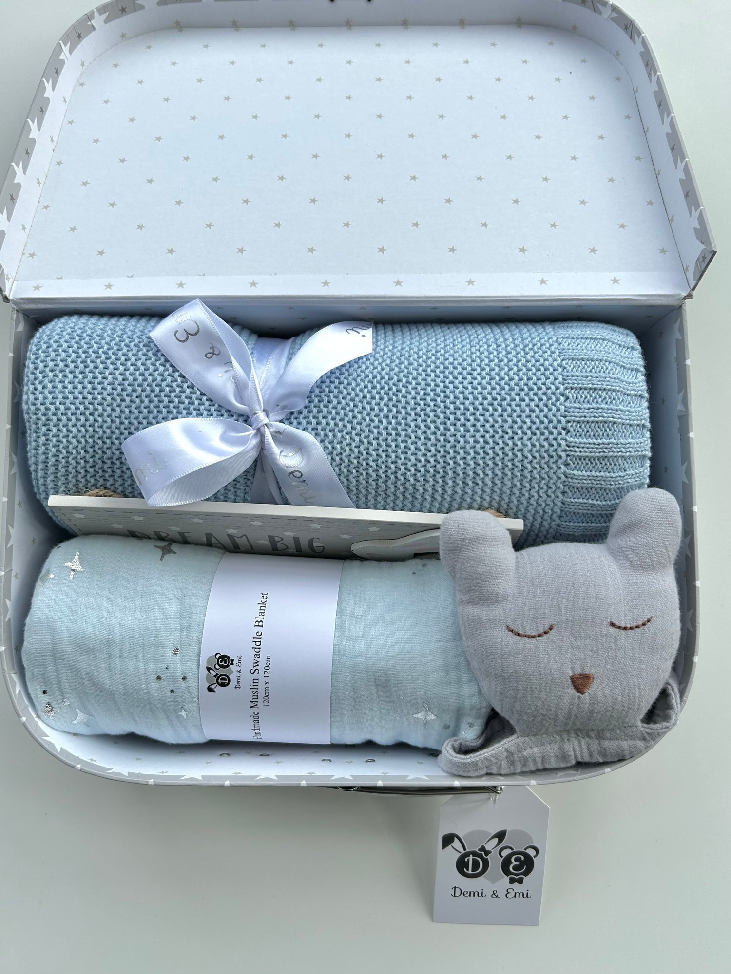 All of our grey and white star gift cases make beautiful keepsake boxes and look adorable in a baby's nursery. Inside the large gift case, we have a luxury Cotton Blanket, an Organic Cotton Muslin Comforter, a Large Organic Swaddle and a 'Dream Big Baby Plaque'. Please specify if you wish to have a Bunny or Bear Comforter in your gift.